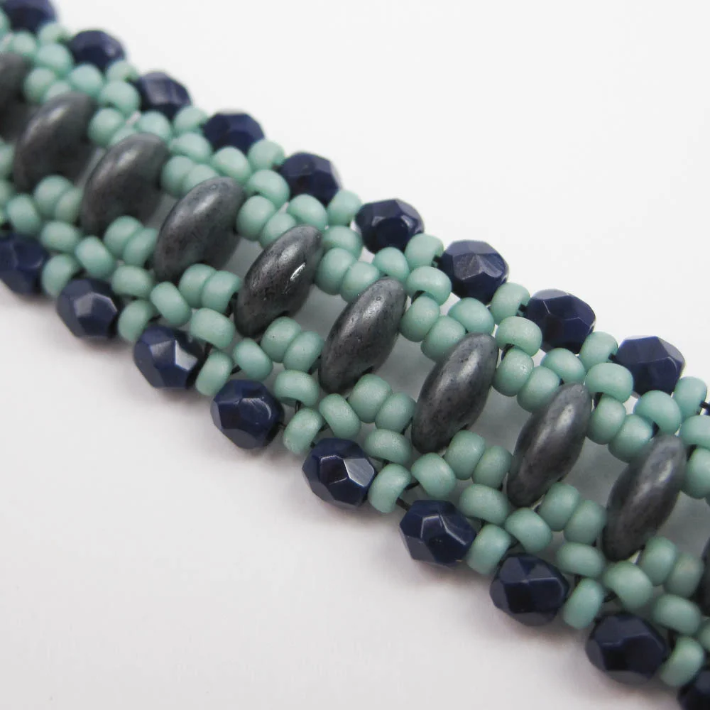 This simple and elegant bracelet uses Czechmate two-holed lentils to build a long pathway surrounded by seed bead picots and sparkling fire polish.