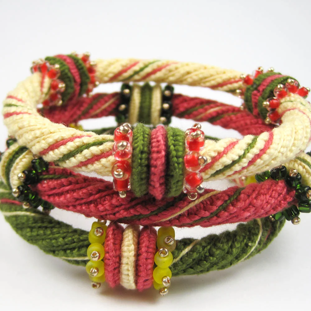 A set of 3 coordinating bangle bracelets featuring kumihimo over a core.